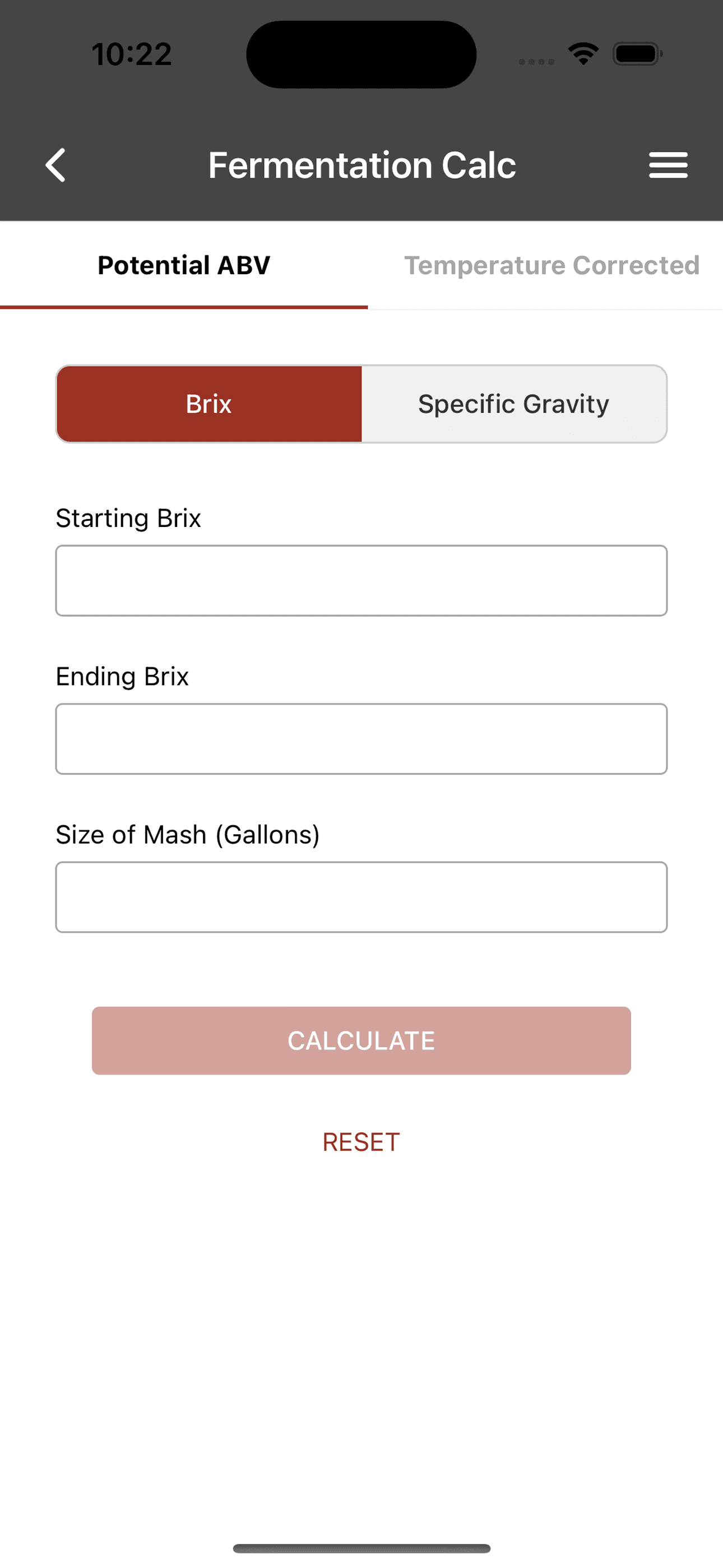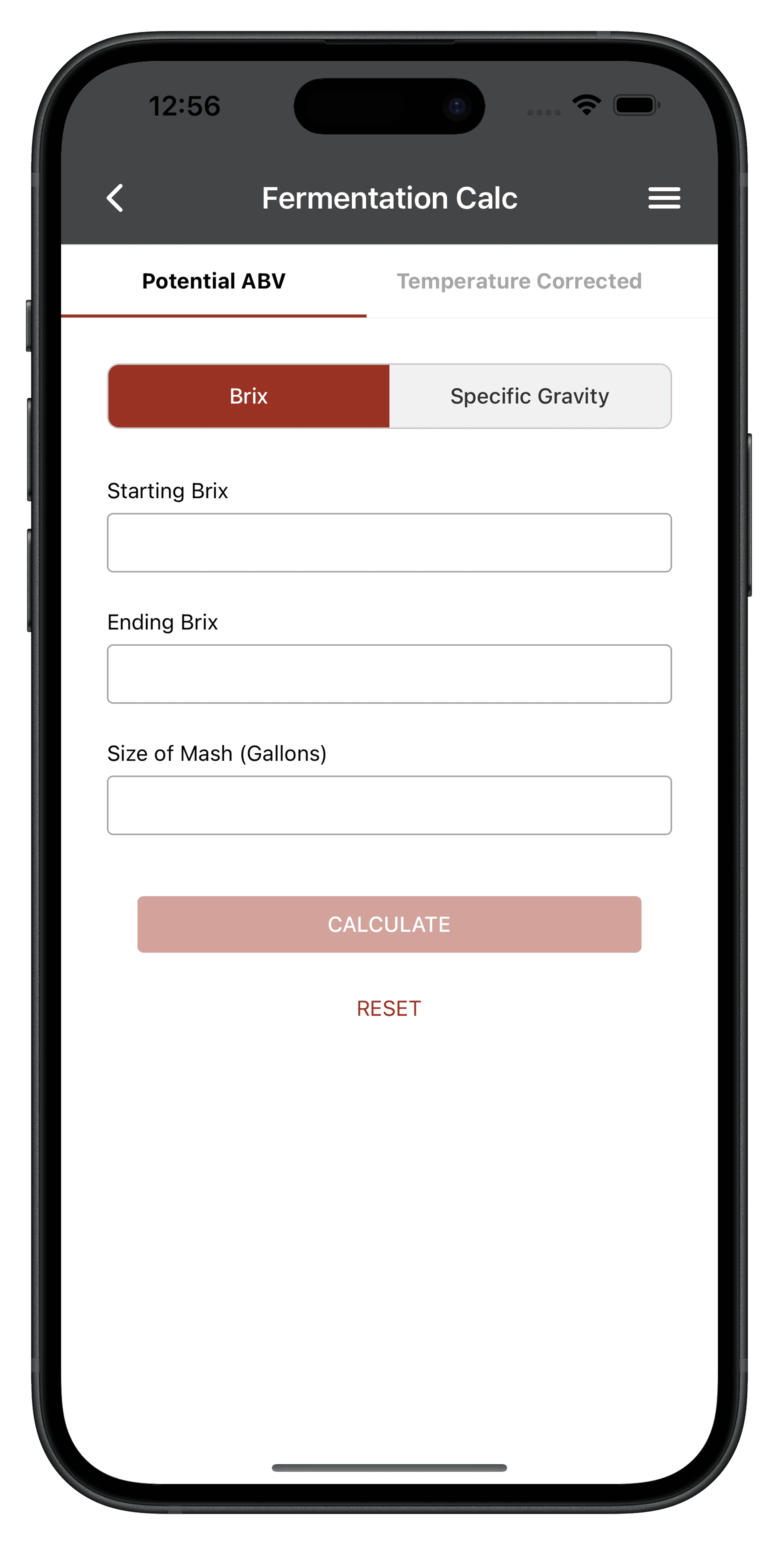 Allows users to calculate potential ABV using either Brix or specific gravity, supporting different tools and measurement preferences in the field.