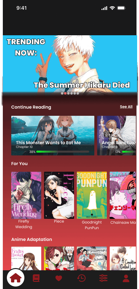 Combines trending titles, continue reading, and curated recommendations into a single, tailored feed.