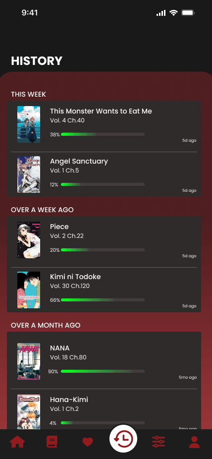 Shows recently read manga with clear progress indicators, helping users quickly pick up where they left off.