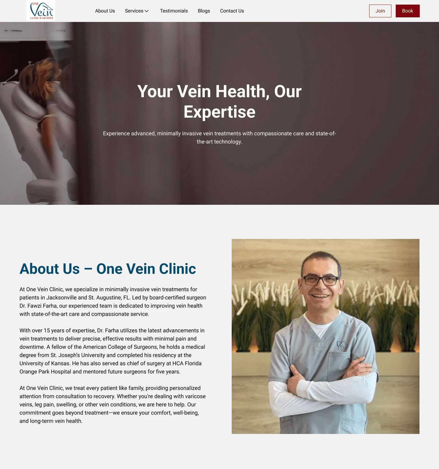 Redesign One Vein Clinic's website to increase patient conversions by improving service discoverability, establishing credibility through prominent trust signals, and creating clear, consistent conversion paths across all pages. The solution needed to balance medical professionalism with approachable design while delivering a seamless, mobile-optimized experience that guides potential patients from awareness to booking.